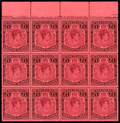 1942 (Oct.) £1 purple and black on carmine paper top marginal block of twelve, unmounted o.g. HPFs #4, 28a and 17a gash in chin. An unusual large multiple and very fine. SG 114a, af, £2990