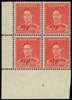 1938-41 2d scarlet perf 15 x 14 lower left corner block of four, without imprint but with perforation pip, unmounted o.g. The coil perf with uniformly large holes, a rare block. SG 184a var., ASC 188bk/zs