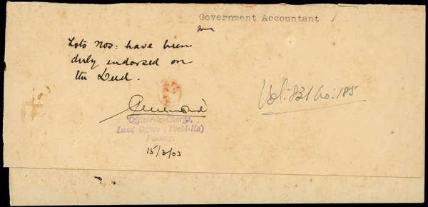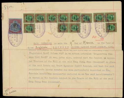 Revenues. 1943 Indenture bearing Straits Revenue $100 with Okugawa Seal and Perak $5 DAI NIPPON 2602 MALAYA x 12, violet DAI NIPPON STAMP OFFICE PENANG oval datestamps of 11 MAR. Rare