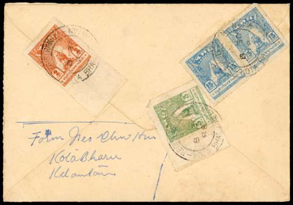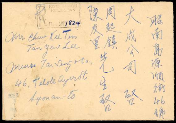 1945 registered envelope to Singapore bearing (on reverse) 2c, 3c and 15c pair with Kota Bharu Registration CDSs of 8.30.88. Boxed registration handstamp on front. Ex Rowell. SG TM2-3, 6