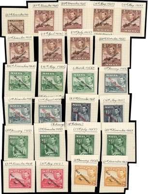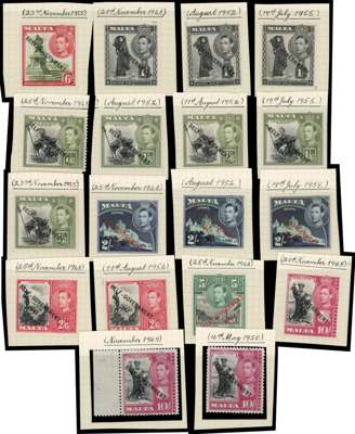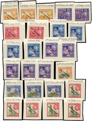 1948-55 New Constitution mint printings collection, written up on small pieces (first light hinge) with ¼d, ½d x 8, 1d x 6, 1½d x 6, 2d x 7, 2½d x 4, 3d x 9, 4½d x 4, 6d x 6, 1/- x 3, 1/6d x 5, 2/- x 3, 2/6d x 2, 5/- and 10/- x 3. All individual printings save two which are shades within printings. Assembled while the stamps were current with the dates believed to be reliable; a lovely group. SG 234-248