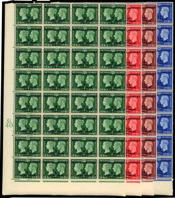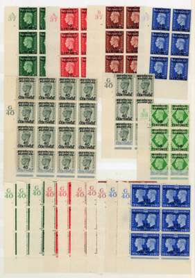 1937-51 Cylinder blocks mint. 1937 set (mixed hinged and unmounted) with 40c Cyl. 1 blocks of 6 and sixteen, both unmounted, the latter with gum a bit dark; Centenary set various blocks including of twenty-four, including 25c Cyl. 2. block with R20/2 neck retouch; Olympics two sets, 30c in each with Crown flaw, gum lightly discoloured; 1952 5c, 15c (2, one with R19/1 forehead retouch), 25c and 40c. Condition a bit mixed. SG 165/186