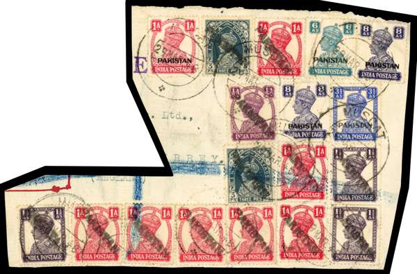 1948 piece from registered envelope to UK franked with Pakistan adhesives; Nasik overprints on 1a, 3½a, 6a and 8a (2, one torn) and local handstamps on 1938 3p (2) and 1940-3 ½a, 1a (7) and 1½a (3). An amazing franking. BPA Certificate (1998)