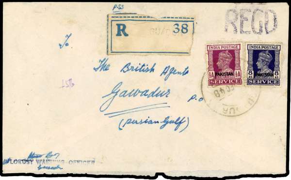 Postal History. 1948 registered envelope used locally (from the Guadur Locust Warning Officer) bearing Pakistan ¼a and 8a with DEC 30 CDS Type 9A, registered label Type 14. Rare, BPA Certificate (1972), ex Donaldson