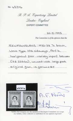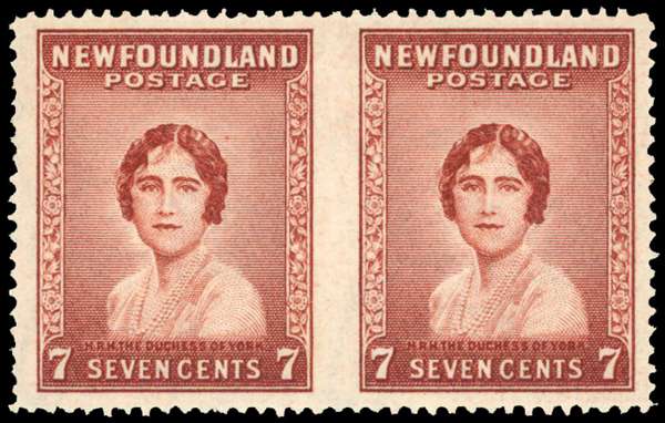 1932-8 7c red-brown line perf 14 horizontal pair, imperforate between, large part o.g. Fine. BPA Certificate (1995). SG 226ba, £650