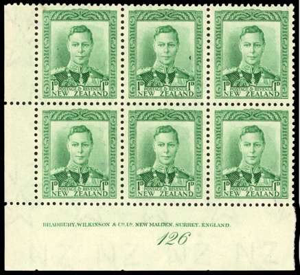 1938 ½d green Plate 126 corner block of six with imprint and Plate 126, first coarse paper, fine o.g., hinged on centre stamp in top row only. Minor natural gum bends. A very rare Plate block, ex Baillie. SG 603