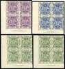 1949-50 Arms 10/-, £1 and £2 imprint blocks, unmounted o.g. Two blocks of the £2, shades, one on slightly thinner paper; each with R4-5/1 roller flaw. SG 224b-da, £1308