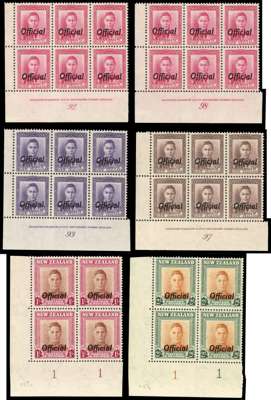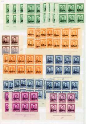 Officials. 1938-51 King's Head Plate blocks (52) mixed mounted and unmounted o.g., a very good collection including 1d scarlet #4, #6 left and right, 1d green Fine HM #29 and Coarse HM #85, 1½d chocolate #21 (hinged on selvedge only), 2d Coarse HM #86 and 87 (both unmounted), 3d Fine VM #39, 4d Coarse VM #90 (unmounted), 8d #93, 9d #97, 2/- sideways #1-1. Mostly very fine. SG O134/158