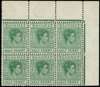 1938-42 ½d green top right corner block of six with R1/5 RP ‘Accent’ flaw, and 2/6 bulge in frame behind King's head, fine unmounted o.g. SG 149b, £550