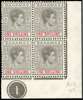 1942 1/- brownish grey and scarlet on thin striated paper, lower right corner Plate 1 block of four, unmounted o.g. A very rare multiple; BPA Certificate (1985, as CW 15a). SG 155a, £3800