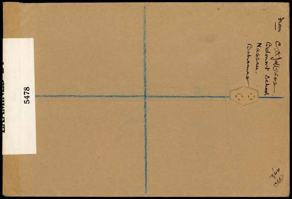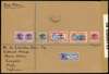 1942 Landfall values on 24 x 16mm envelope to UK; 2d, 4d, 8d, 1/- and 5/- pair, censor tape at right. The right 5/- with an early state of the broken ‘OF’; very rare in used condition. SG 174b, unpriced used