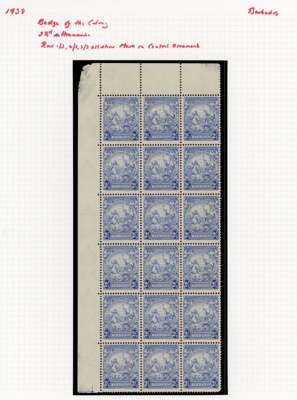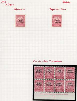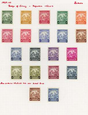 1938-50 mint collection on leaves. Includes perfs and shades of the 1938 set, with ½d perf 14 and 1d perf 13½ x 13; 4d perf 14 Flying Mane block unmounted; 3d brown perf 13½ x 13 and 3d blue each with R4/10 line over horse's head, large part o.g.; ½d green perf 13½ x 13 recut line mint, 2½d ultramarine block with R1-3/3, 4d joined scroll perf 13½ x 13 block mint and perf 14 single unmounted; Victory 1½d unmounted block with R5/2 two flags; 1947 1d on 2d perf 13½ x 13 imprint block with R11/4 broken ‘E’ unmounted, 1950 set hinged. Ex Baillie. SG 248/282