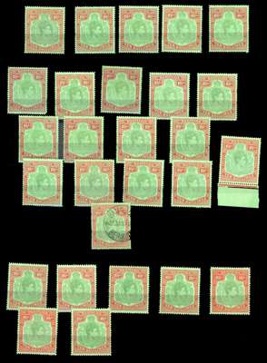 1943/52 10/-s, 26 mint singles and one used. Some of the earlier perf 14s have toned gum and viewing is advised. SG 119c/f