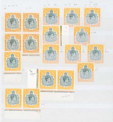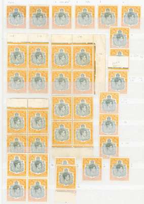 1938-52 12/6d range (54) on stocksheet, all large part o.g. or unmounted. Includes 6 blocks, some being earlier printings with some gum staining, but generally a good range with flaws noted. SG 120a/e