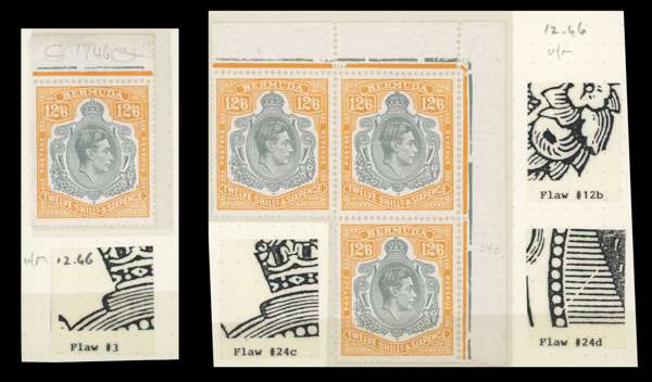 1940-6 12/6d small range on stocksheet, almost all with identified flaws. 22 stamps with two Oct. 40, the balance 1943 or Dec. 46. Four used, the balance mint, with eight of these unmounted. SG 120a, c