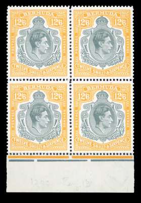 1952 (Sep.) 12/6d lower marginal block of four, #s 45-58 with no HPFs, unmounted o.g. SG 120e, £400