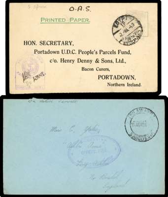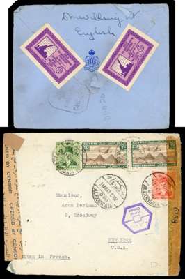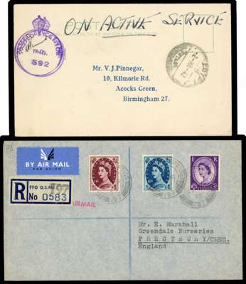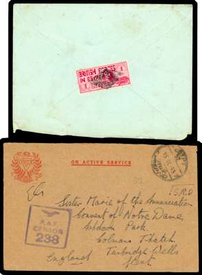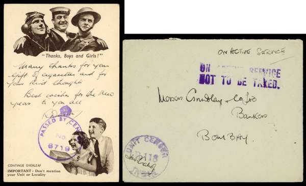 POSTAL HISTORY: World War II duplicated censored mail selection, loose and housed in a carton, including Army, RAF types with some registered and mainly from Great Britain, India with envelope to London, the reverse with ‘HELP DEFEND YOUR COUNTRY/SIND WAR GIFTS FUND’ LABELS (2), South Africa with forces in Egypt and Southern Rhodesia with several ‘RHODESIAN/OFFICIAL FREE/AIR TRAINING GROUP’ cachets in purple and black. A very interesting lot well worth careful inspection. Mostly fair to fine (thousands)