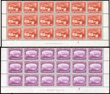 1950 $2 and 1952 $3 perf 14 x 13 lower three rows of sheet of each, with imprint and Plate 1, unmounted o.g., unfolded. Fine multiples. SG 318a, 319b, £1296