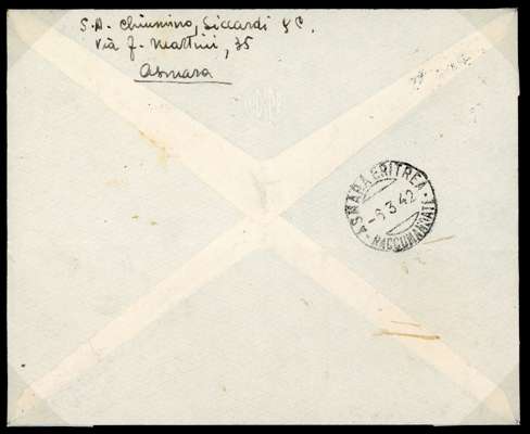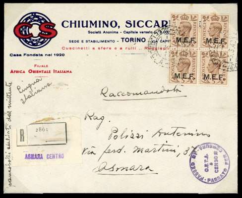 1942 Nairobi 5d round and square stops block of two vertical se-tenant pairs on local registered envelope, Asmara Centro registered label and CDSs on the stamps (5.3.42). Censor strike in purple. SG M10b, £2000 as two se-tenant pairs