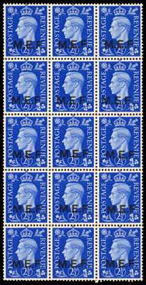 1942 Nairobi 2½d ultramarine block of fifteen (3 x 5) fine unmounted o.g., from rows 6-10 with the second row having square stops. RPS Certificate (1985). ex Bater. SG M8a, b, £1560