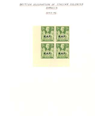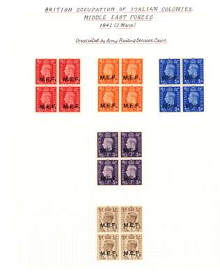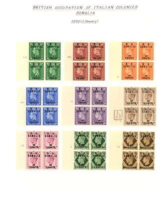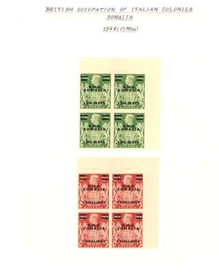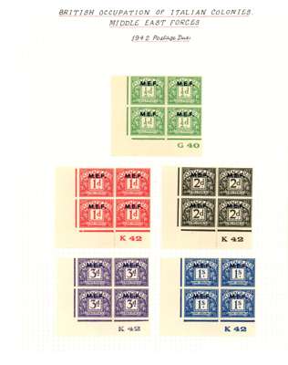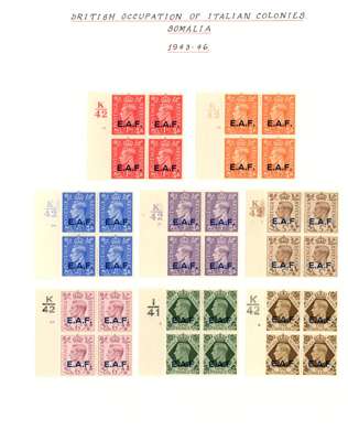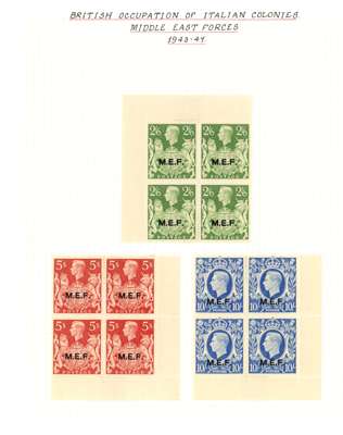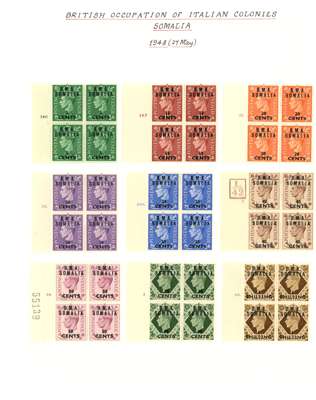MEF and Somalia mint blocks of four. MEF with 1942 Cairo ½d - 5d set of five, 1943-7 set with the low values having Cylinder numbers and the high values in corner blocks with the lower pairs unmounted, Dues Cylinder blocks. Somalia complete with all low values with Cylinder numbers and the high values in corner blocks with two stamps each unmounted. SG M1-5, 11-21, MD1-5; S1-31, £1002