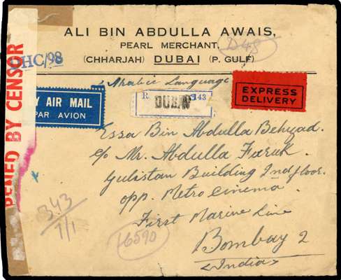 1943 envelope from a Pearl Merchant at Chharjah, Dubai registered label and red EXPRESS DELIVERY label. On reverse, India 1941 3p block of six, 1937 1a pair and 2a6p x 2, Dubai CDSs 7 JAN 43, Kalbadev/Bombay delivery 20 JAN. The 1a pair partially overlapped by censor label. Faults including reduced at left, still an appealing cover