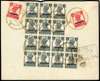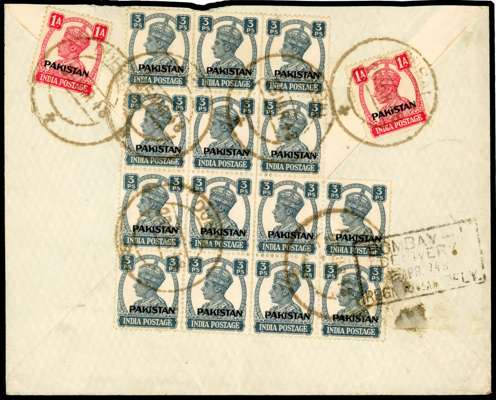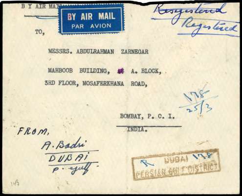 Postal History. 1948 registered envelope to Bombay franked on reverse by Pakistan block of fourteen 3p and two 1as, Dubai CDSs of 25 MAR; boxed DUBAI/ PERSIAN GULF DISTRICT on front (Donaldson Type 9). Central fold but still a fine cover, ex Donaldson