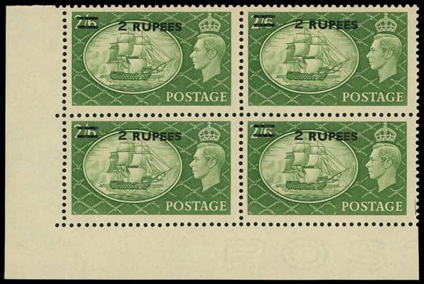 1955 2r on 2/6d yellow-green corner block of four, surcharge Type II, unmounted o.g. Gum a little creamy, otherwise fine and a scarce multiple, ex Donaldson. SG 41a, £1600