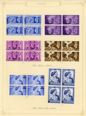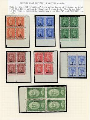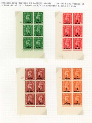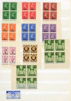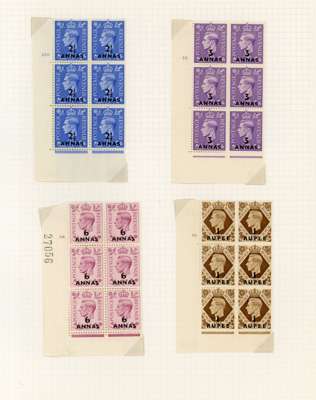 1948-51 mint group with 1948 Cylinder blocks of six to 1r, hinged on selvedge and one stamp only, also unmounted blocks of four, and 2r blocks x 2 both with toned gum; UPU 2½a unmounted with Lake in India; some hinged multiples on leaves with Wedding block, two unmounted; and the 1950-1 set in unmounted blocks of four. SG 16/41
