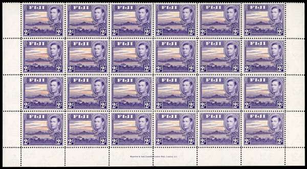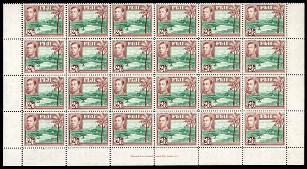 1938-55 mint collection (thousands) in three stockbooks. A very large accumulation, put together with the intention of studying the printings. Mostly in multiples with the great majority unmounted, including many Plate blocks, imprint blocks and quite a few varieties, with (no doubt) more lurking unremarked. Noted; 7 x ½d perf 14 blocks with three being Plate blocks, extra frond block, 56 x 1½d blocks (up to full sheets) with perf 14 top two rows of sheet, three other blocks, one a Plate block, and an imprint/Plate strip of three; 5 x 2d Die I blocks with two being imprint, and one Plate; 9 x 2d Die II blocks including imprint; 8 x 2d green and magenta scratched building blocks; 2½ds (all perfs) with 11 x Extra Islands; 9 x 5d blue and scarlet blocks, including (blank) Plate block and imprint block; 3 x 6d Die I blocks, one an amazingly fresh Plate block, and 7 x 6d violet-black blocks, one of 9; lots of middle values and 7 x 10/- blocks, three being Plate blocks, and 8 x £1 blocks, four being Plate blocks. A significant holding. SG 249-266b