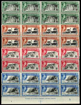 1938 1/-, 2/-, 5/- and 10/- perf 14 lower marginal imprint blocks of eight, all with frameplate numbers under R10/5,the 1/-, 5/- and 10/- with vignette plate numbers under R10/2. O.g., with the lower stamps in each block unmounted, the 10/- with a little central splitting; scarce multiples in this perf. SG 127-130, £2440
