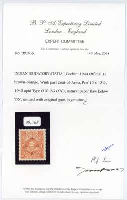 Official. 1943-44 1a brown-orange, watermark 27 with Type O10 opt, perf 13 x 13½, fresh o.g., natural paper flaw still a fine example of this major rarity. One of the key stamps of the KGVI reign. BPA cert (2024). SG O70, cat £16,000.