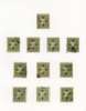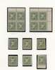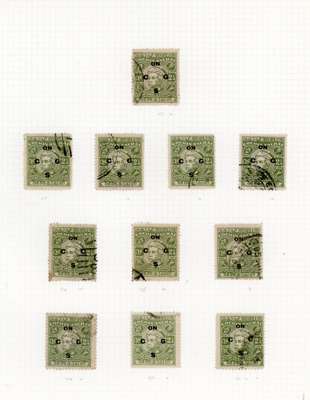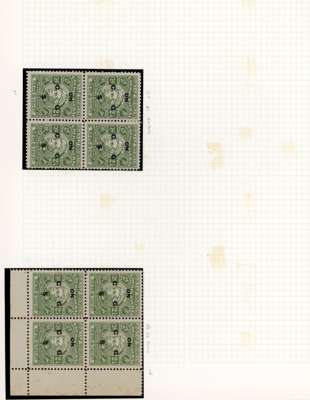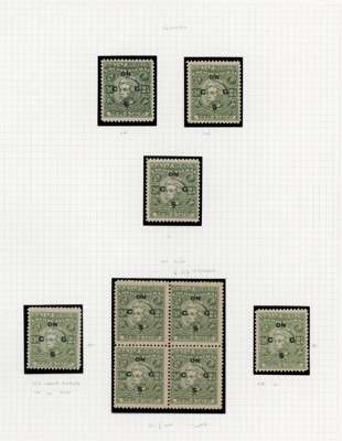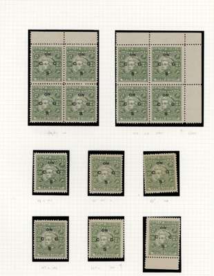 Officials. 1948-9 2¼a yellow-green study collection (90) on leaves with sheet of forty-eight, R1/4 ‘C’ for ‘G’ and 1/5 flat back to G, and another block with the same varieties, plus flaws and shades. The mint/unused mostly with patchy or no gum. Ex Trowbridge. SG O97, a