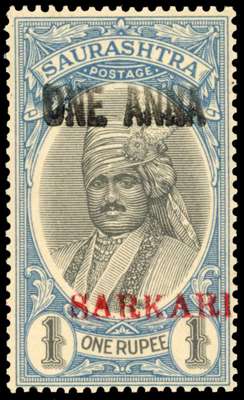 Official. 1948 1a on 1r black and pale blue, handstamped surcharge 4mm high, type O2 ‘SARKARI’ opt in red, unmounted o.g., fractionally toned still fine for this very scarce stamp. BPA cert (2024). SG O19, cat £1700