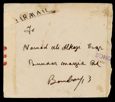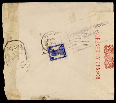 1945 envelope to Bombay with (on reverse) India 3⅓a tied by Kuwait datestamp with wavy lines at right of 22 FE 1945. Censor label and violet boxed PASSED BY CENSOR/ KUWAIT. A little grubby, but scarce. SG Z66