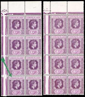 1942-7 6d ordinary paper corner block of eight with R3/1 RP break in value tablet and 4/1 broken ‘E’, large part o.g. with the stamps unmounted; matched with 1949 printing block, stamps unmounted, showing both varieties repaired. SG 109ab, £600