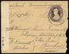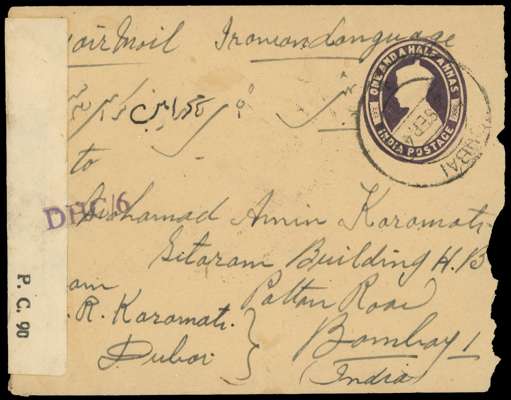 1944 India 1½a postal stationery envelope with 1a India adhesive on reverse, each with Dubai CDS of 2 SEP 44. Censor tape and octagonal handstamp, Bombay arrival on reverse. Roughly opened at right