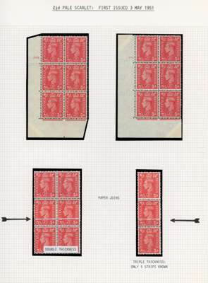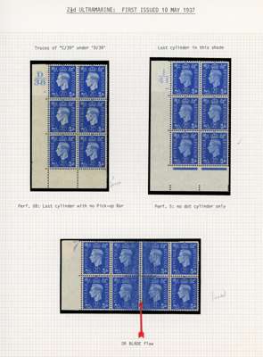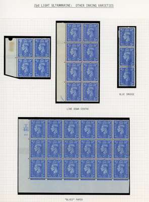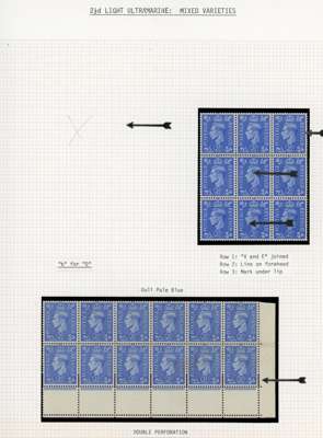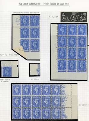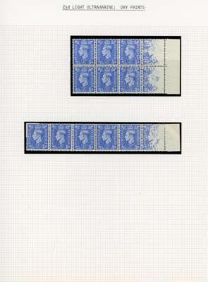 1937-52 2½d mint collection on leaves. includes 2½d ultramarine Cyl. 65 no dot (stamps unmounted); block of eight, four affected by smeary doctor blade flaw, good appearance but foxed. Pale ultramarine with block with corner fold-over giving extra perfs; ‘b’ for ‘d’ block unmounted; badly misperforated single; dry print single (mostly blank) and block of eighteen, fine appearance but a little toned on reverse, mostly affecting the right six stamps (adhesion on the reverse of some of the others); further dry print strip of six and block of eight; Cylinder blocks including perf Type 6 Q45/184 dot unmounted; double perf block of twelve; other inking flaws including tinted paper Cyl. 202 block of eighteen. Pale scarlet with block of six on double thickness paper, and vertical strip of three on triple thickness paper (stated only five strips known). SG 466, 489, 507