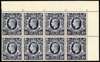 1939 10/- dark blue top right corner block of eight, o.g., hinged on the selvedge only. R2/5 blot on scroll, 2/7 retouched lower lip. SG 478