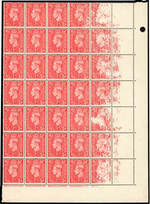 1941-51 1d pale scarlet corner block of forty-two, o.g., hinged on the selvedge only. From the lower right corner of the sheet, with the right strip of seven showing a very strong dry print leaving most of the design blank, with lesser effects on the adjacent stamps. Striking. SG 486 var