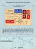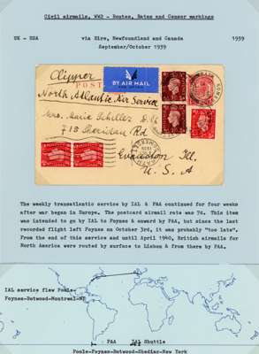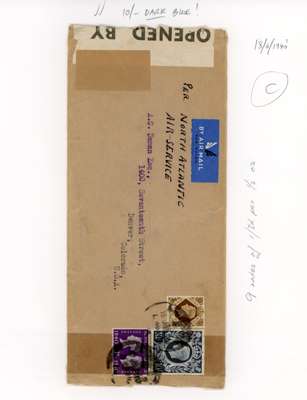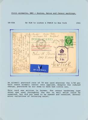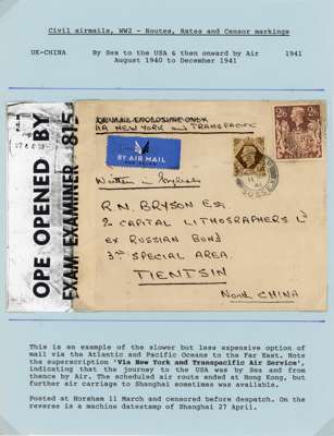 Postal History. 1940-1 airmail rate covers to USA (3) and China (2). Two postcards to USA, one uprated stationery, both at the 7d rate initially via Lisbon but one FAM 18 and the other via Canada; 9" x 4" 1940 (?) envelope to Denver with 10/- dark blue, 1/- and 3d Centenary (9 times rate), smudgy postmarks but rare; two envelopes to China, one at 1/6d to Shanghai via India and Thailand, the other at 3/6d (2/6d brown plus 1/-) to Tientsin via sea to New York and onward by air. Ex Ian Warn
