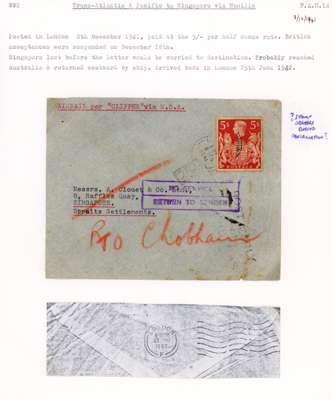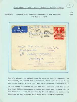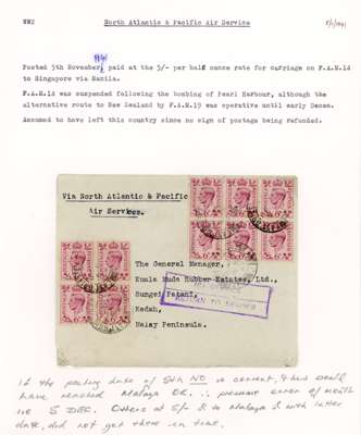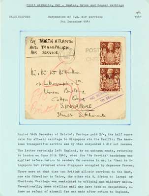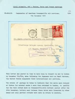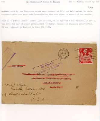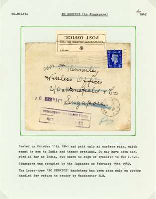 1941 October to December covers from GB to Malaya with high value frankings (four with single 5/-s, one with ten 6ds and one with two 2/6d browns), none of which made it to the destinations. Mostly with boxed NO SERVICE/ RETURN TO SENDER; one (to 11th Indian Division, Malaya) with boxed IT IS REGRETTED THAT THIS ITEM COULD NOT BE DELIVERED AT THE ADDRESS STATED; two with postage refund marks, one for the airmail portion of the charge only. Also 1941 surface rate cover from Liverpool to Singapore with NO SERVICE (loose type) handstamp. Ex Ian Warn