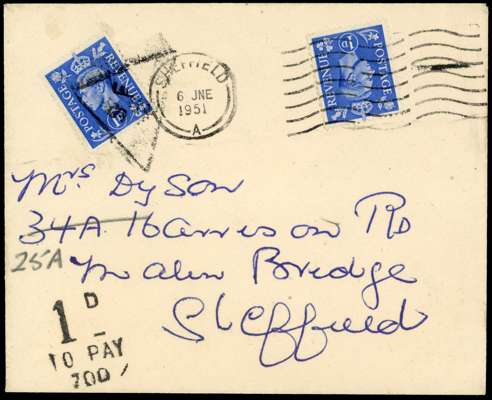 Postage Dues. 1951 envelope locally used in Sheffield, franked solely with 1d light ultramarine. ‘1d TO PAY 700’ handstamp, with a further 1d light ultramarine added in lieu of Postage Due, cancelled by SF in triangle. Rare