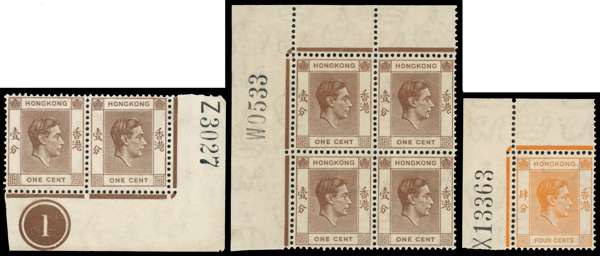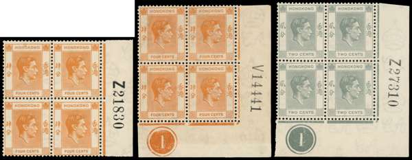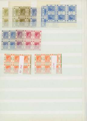 1938-52 blocks (66 plus two pairs and single), mostly unmounted, with a number of Requisition blocks and a few other Plate blocks. Includes a few early printings with 10c, 30c perf 14 and 50c, these a bit aged with two in each block hinged, and two blocks of six of the first $2. A useful group. SG 140/157