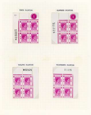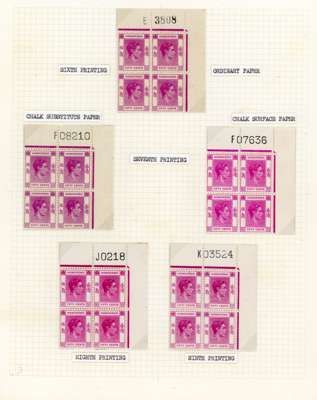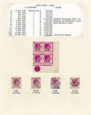 1938-53 50c collection on leaves with the first four printings as singles, three dated used; the post-war printings in mint blocks with Requisitions E, F (2), J. K. N, S, W and X. A fine representation of the later printings, ex Jack Gee. SG 153-c