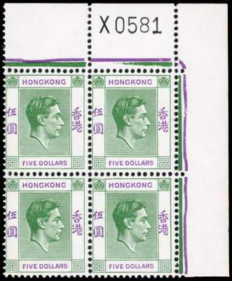 1953 $5 bluish green and blue-violet on chalky paper top right corner block of four with Requisition X, unmounted o.g. Ex Jack Gee. SG 160ab, £520