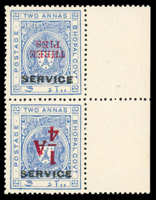 Officials. 1935-6 ¼a and 3p on 2a ultramarine se-tenant pair from the right of the sheet, surcharges inverted, fine large part or full o.g. Selvedge splitting away, otherwise fine. Scarce. SG O320ba, £900