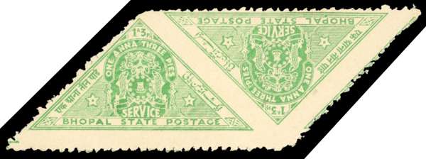 Officials. 1942 1a3p emerald-green pair, imperforate between. Perfs a little rough, otherwise fine. SG O346a, £1000