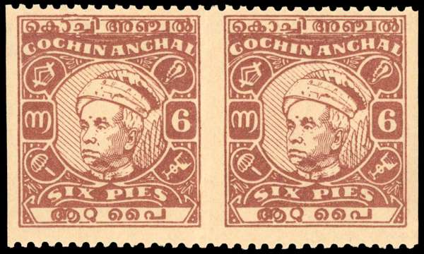 1948-50 6p chestnut horizontal pair imperforate between, fine o.g., almost imperceptibly folded between the stamps, rare. Ex Harell. SG 112a, £1000
