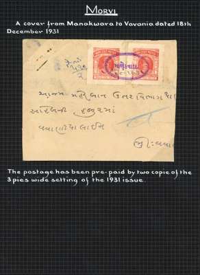 1931-48 covers (7) with 1931 Manakware - Vavania SG 1 pair with violet seal cancel, SG 13 cover with violet seal cancel, SG 10 and 14 on local registered cover; SG 19 registered cover; SG 18a and 19 registered cover, and two uprated postal stationery envelopes. Mixed condition but a good range nonetheless